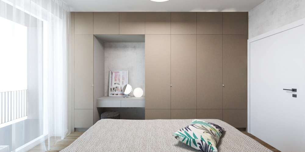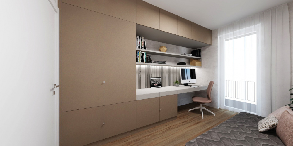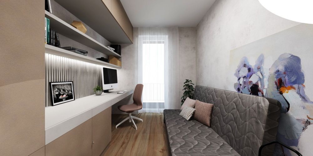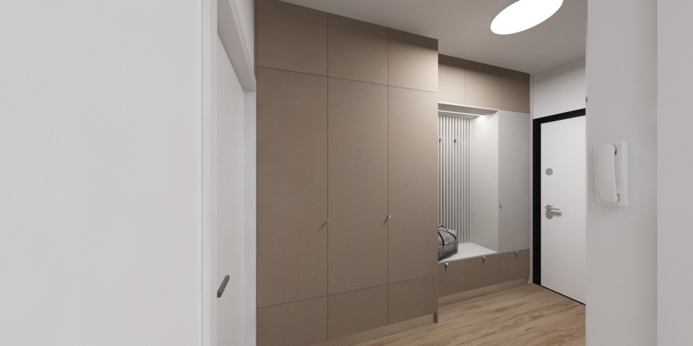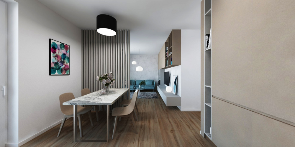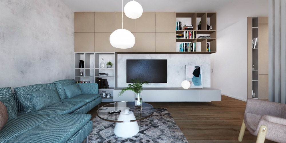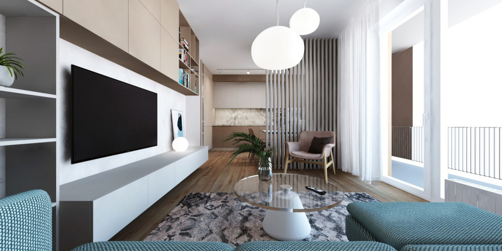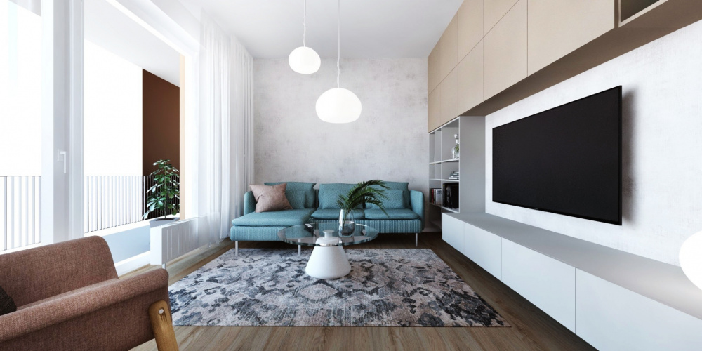 V návrhu interiéru sme zvolili netradičnú kombináciu svetlých šedo-hnedých odtieňov farieb, ktoré sa postarali o jedinečný charakter bývania pre mladú majiteľku. V jednotnom, jemnom koncepte bytu zaujme výrazná tyrkysová sedačka.