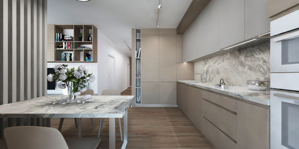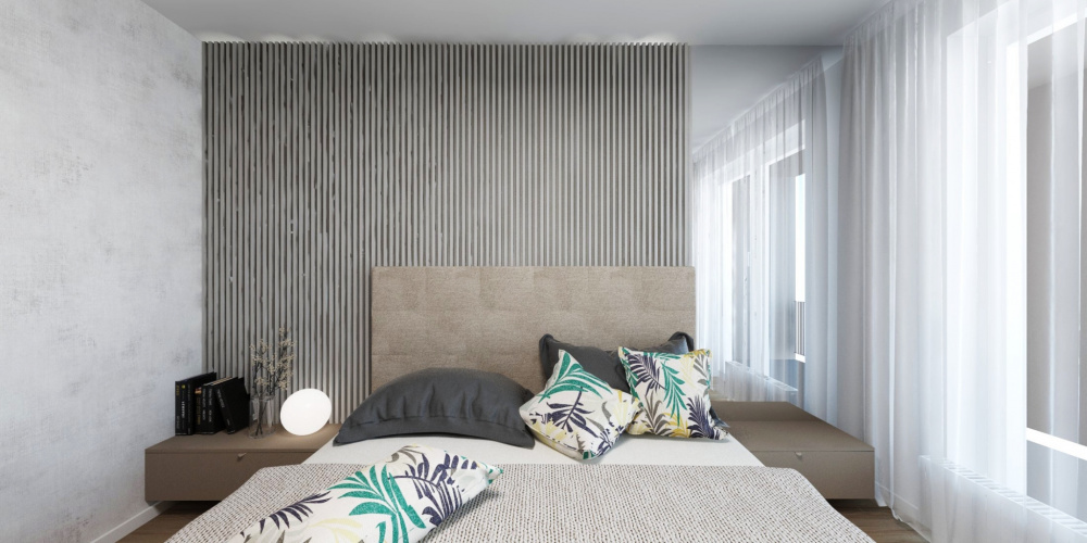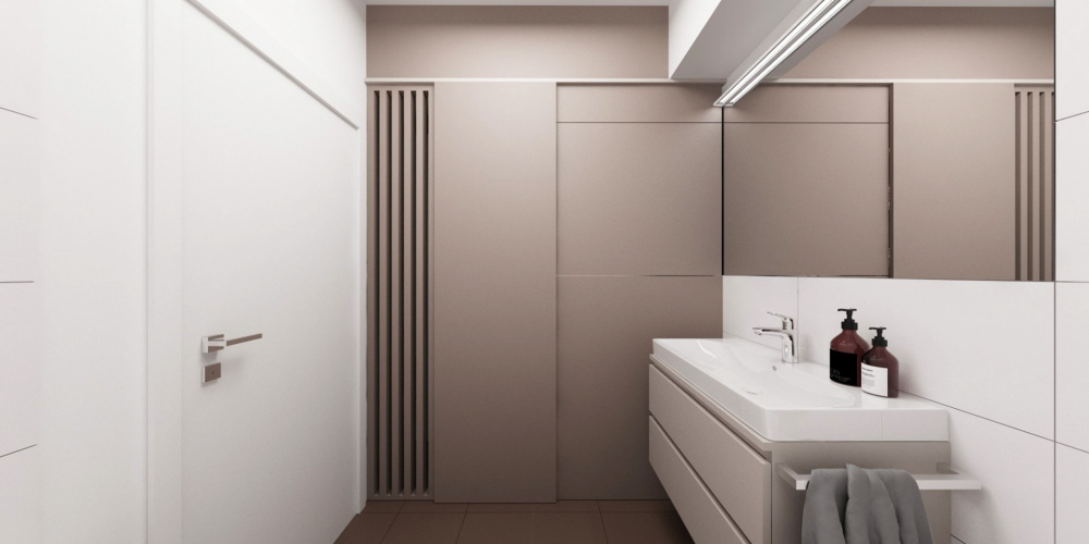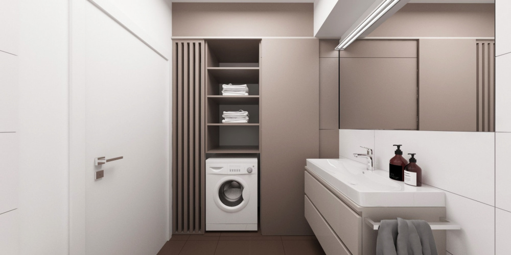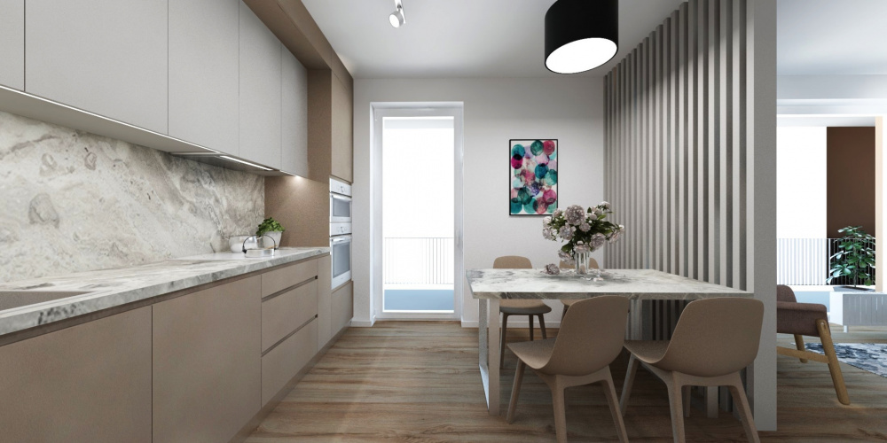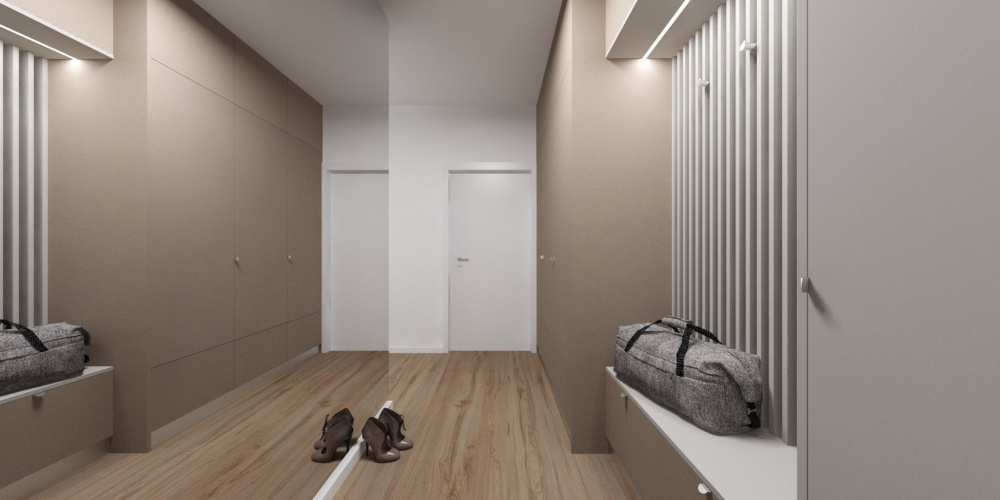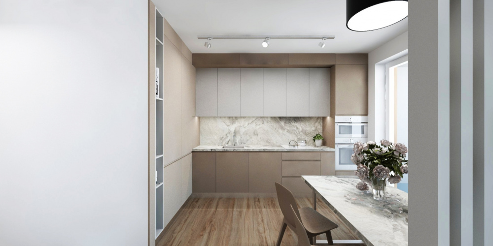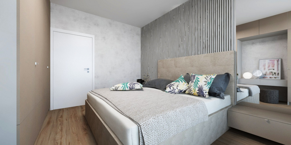 V návrhu interiéru sme zvolili netradičnú kombináciu svetlých šedo-hnedých odtieňov farieb, ktoré sa postarali o jedinečný charakter bývania pre mladú majiteľku. V jednotnom, jemnom koncepte bytu zaujme výrazná tyrkysová sedačka.