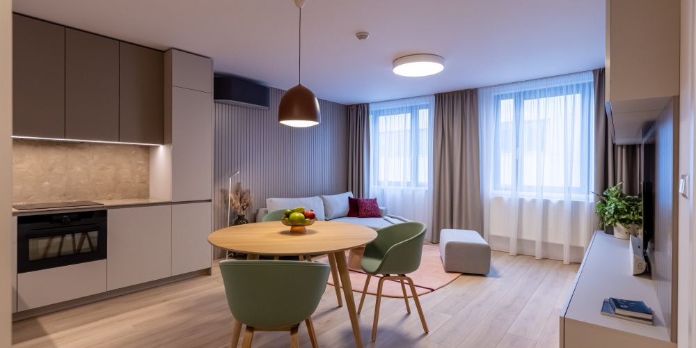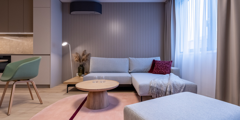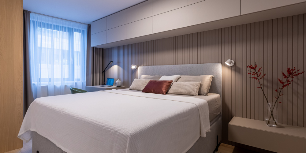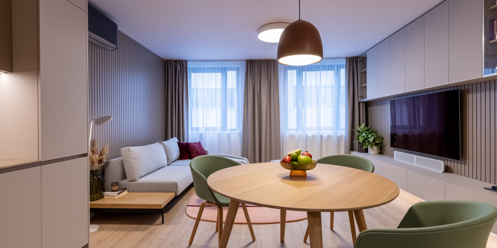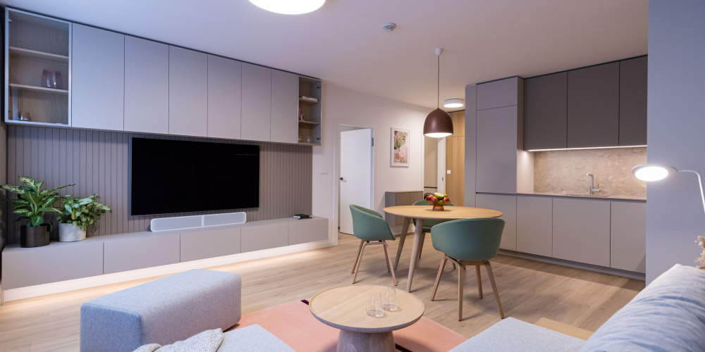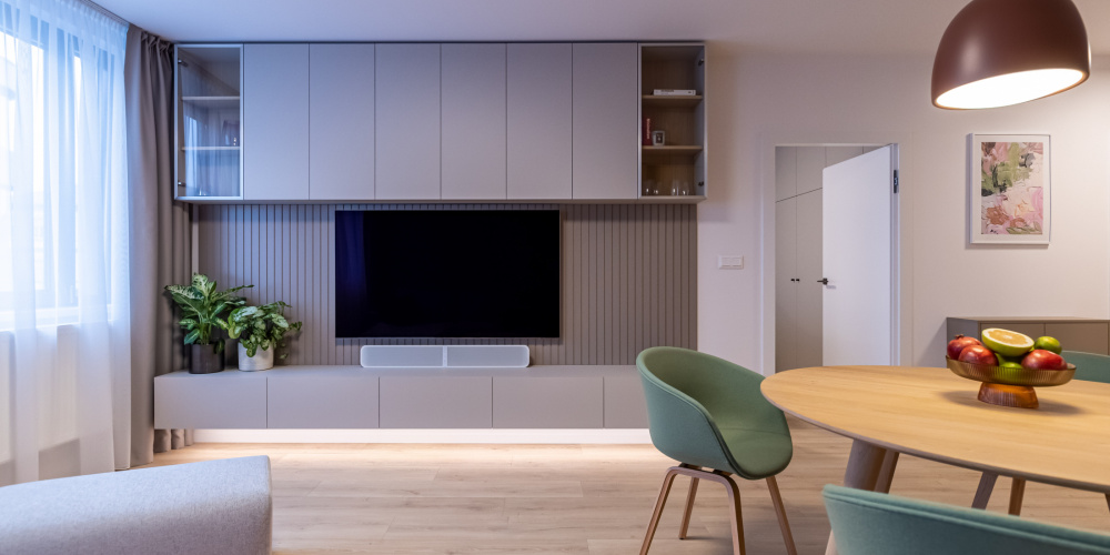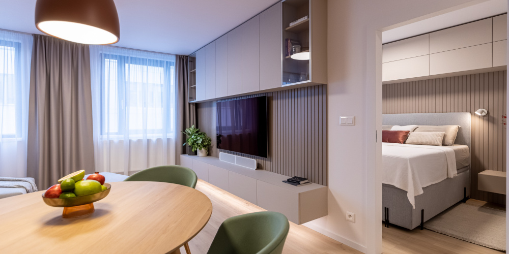 Charakteristickou črtou tohto mestského bytu je jeho béžovo-kašmírová farebnosť, ktorá sa nesie naprieč celým interiérom. Béžovú tonalitu vyvažuje výber podlahy v príjemne svetlom dubovom dreve a farebný dotyk výraznejších tónov v podobe solitérov. Bytu dominujú najmä celostenové obklady s rastrom vrúbkovania, ktoré mu dodávajú neobyčajnú atmosféru. Celý zážitok z interiéru umocňuje výber kvalitného audia, ktoré ocení nejeden fajnšmeker.
