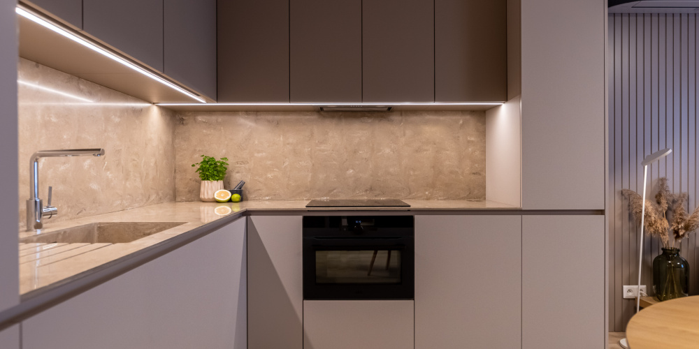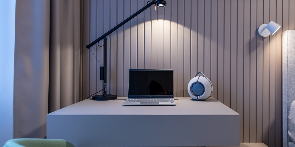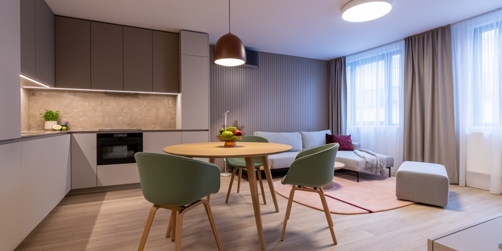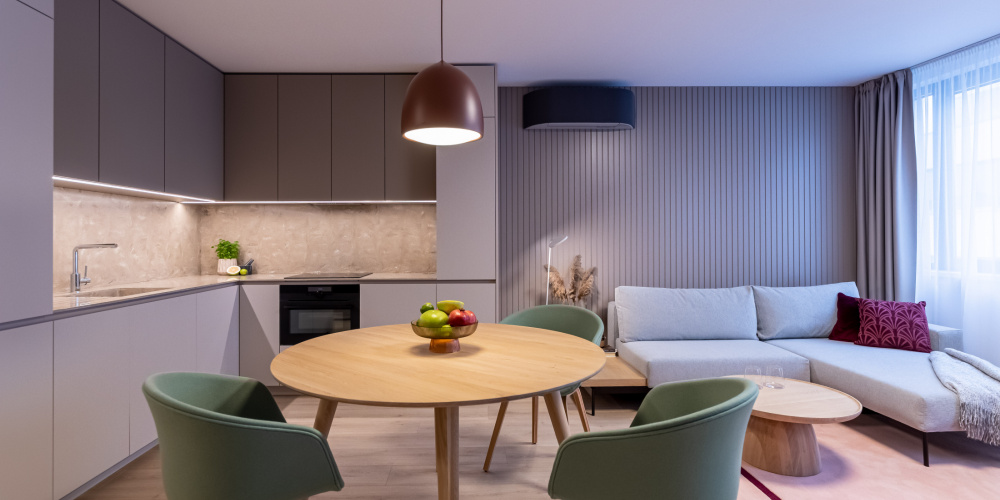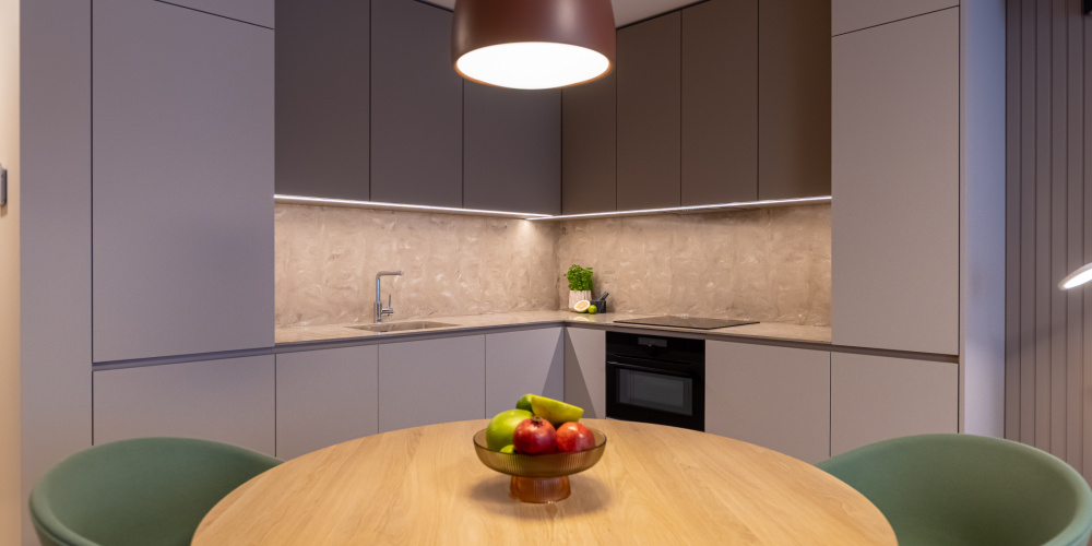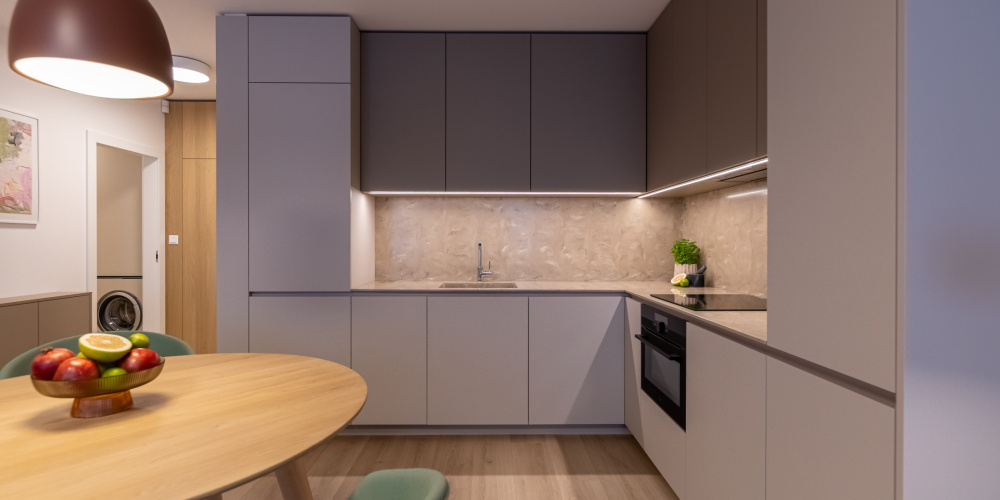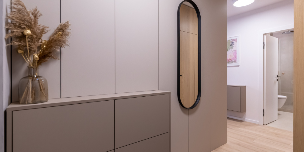 Charakteristickou črtou tohto mestského bytu je jeho béžovo-kašmírová farebnosť, ktorá sa nesie naprieč celým interiérom. Béžovú tonalitu vyvažuje výber podlahy v príjemne svetlom dubovom dreve a farebný dotyk výraznejších tónov v podobe solitérov. Bytu dominujú najmä celostenové obklady s rastrom vrúbkovania, ktoré mu dodávajú neobyčajnú atmosféru. Celý zážitok z interiéru umocňuje výber kvalitného audia, ktoré ocení nejeden fajnšmeker.