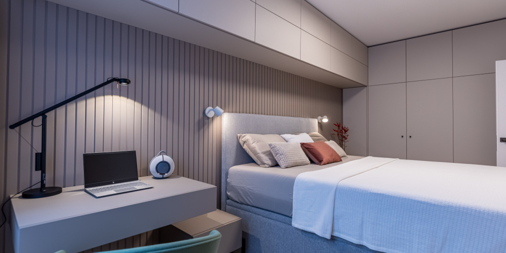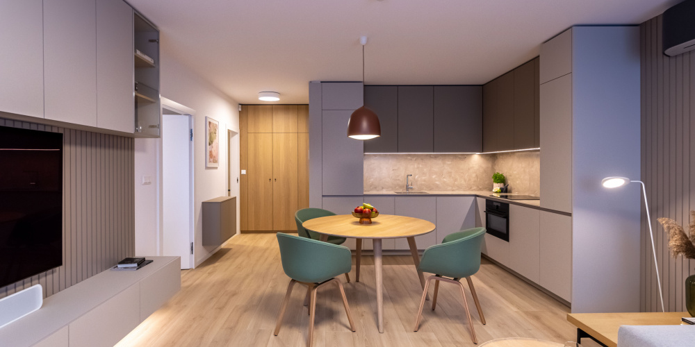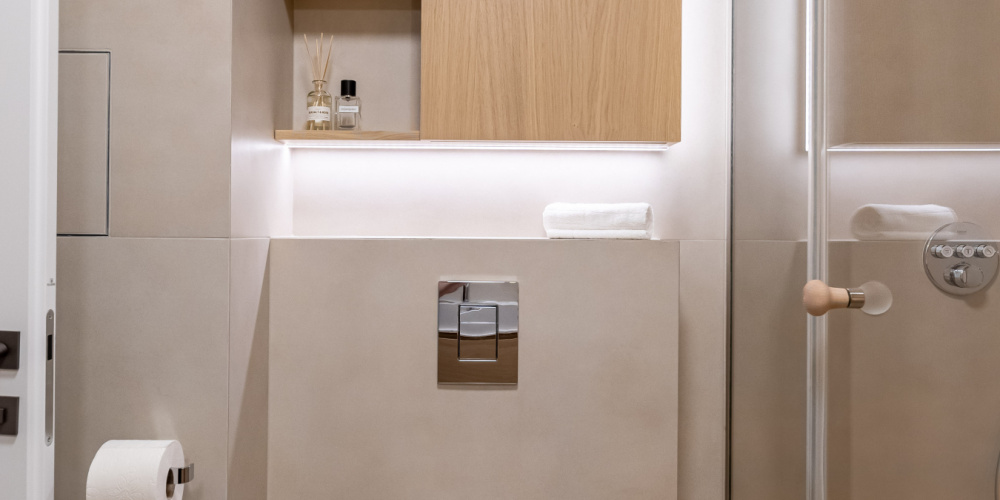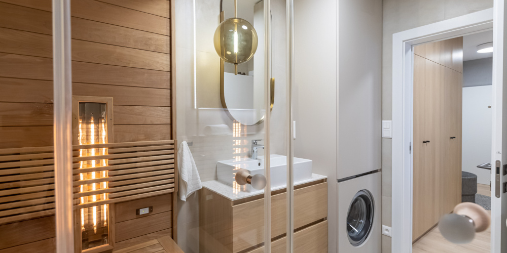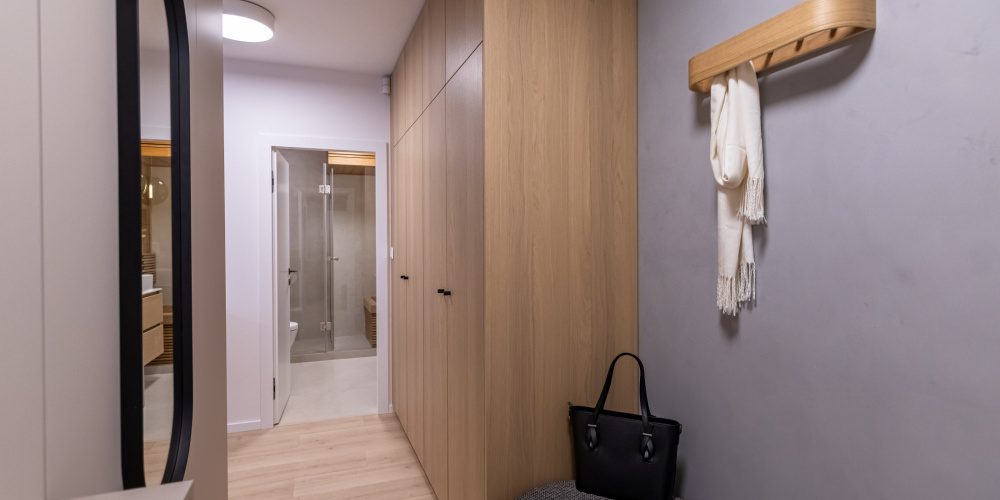 Rozlohou ide síce o menší dvojizbový byt, no rozhodne má veľa čo ponúknuť. Práve v týchto menších bytoch je o to dôležitejšie kvalitné dispozičné riešenie, keďže sú na menšej ploche skĺbené rovnaké funkcie ako v inom veľkometrážnom byte. Na želanie nášho klienta sme z kúpeľne vytvorili oázu pre dokonalý relax po náročnom dni s mini infrasaunou.