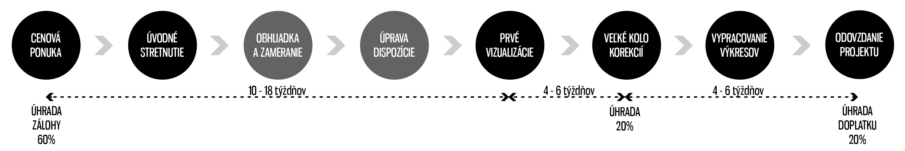 Termíny odovzdávania jednotlivých fáz projektu závisia od aktuálnej vyťaženosti nášho ateliéru, harmonogramu jednotlivých projektov a rozsahu prác. Úhrada zálohy 60% je podmienkou pre zarezervovanie termínu odovzdávania prvých vizualizácií a pre začatie prác na projekte.