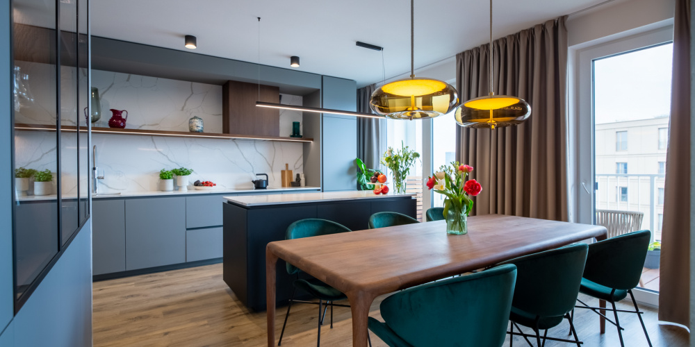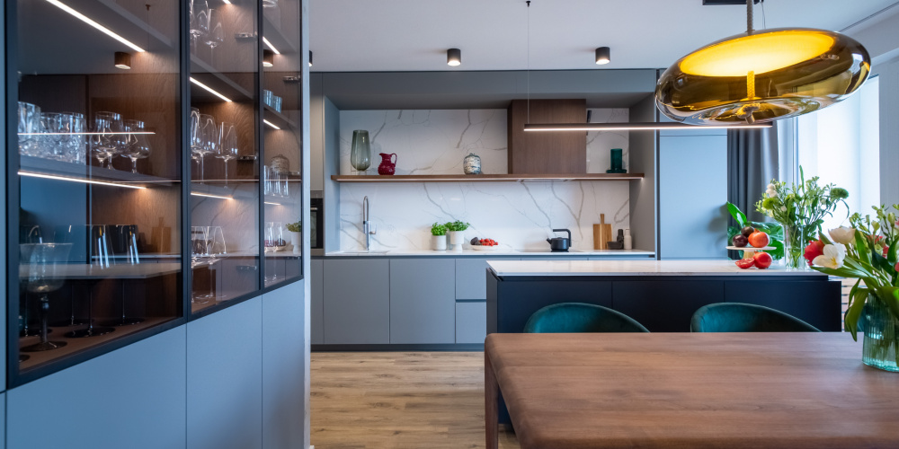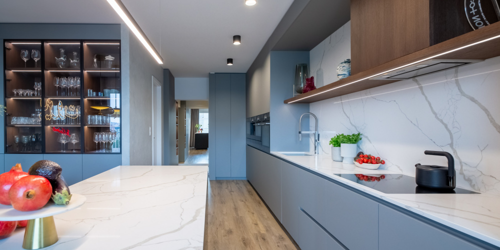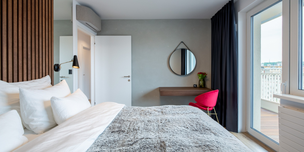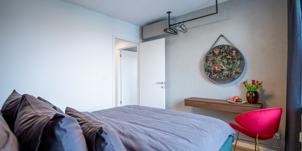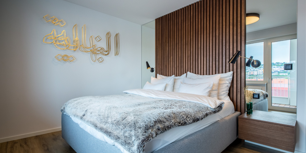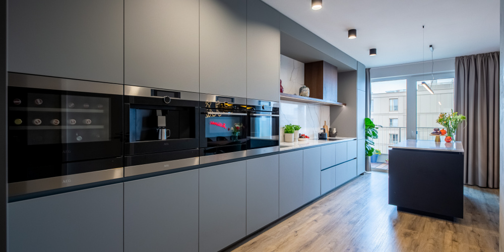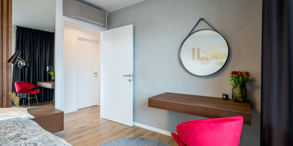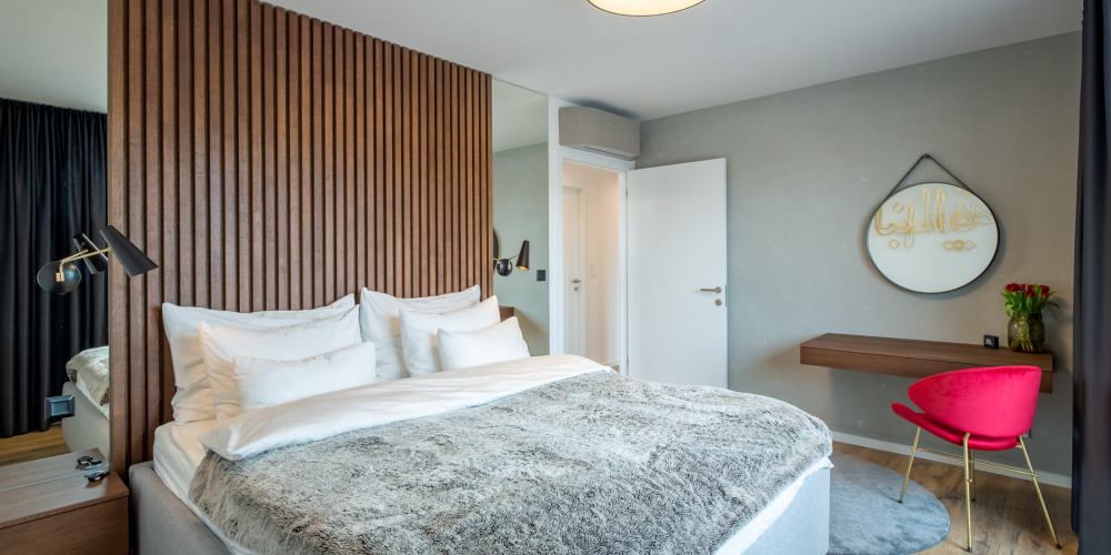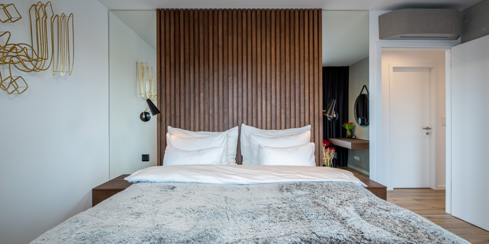 Štedrosť pôdorysu bytu umožnila rozdelenie dennej zóny do dvoch celkov. Prvým je priestranná kuchyňa s kuchynským ostrovčekom. Nočná zóna zahŕňa hlavnú spálňu, hosťovskú spálňu a šatník, na ktorý si klient mohli vyhradiť samostatnú miestnosť vďaka štedrej výmere bytu. AJ preto sme pri návrhu spálni mohli zvoliť minimalistické a vzdušné usporiadanie.