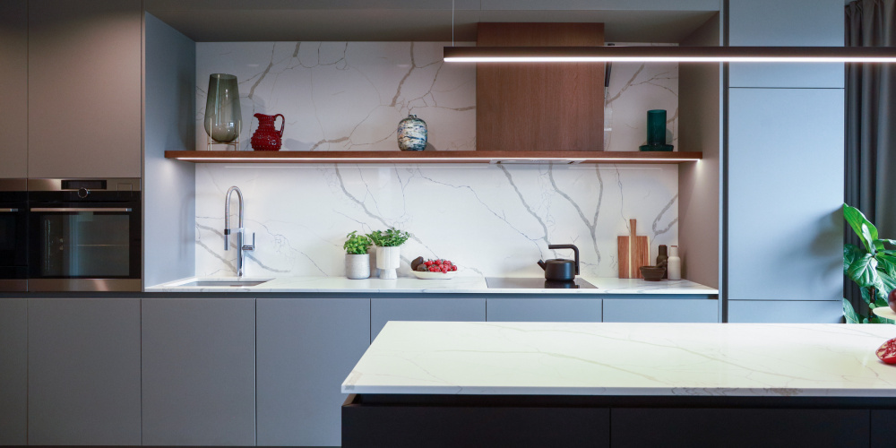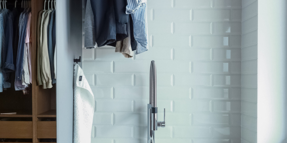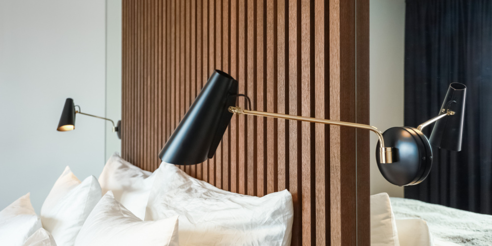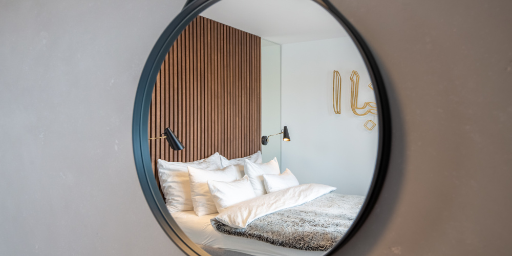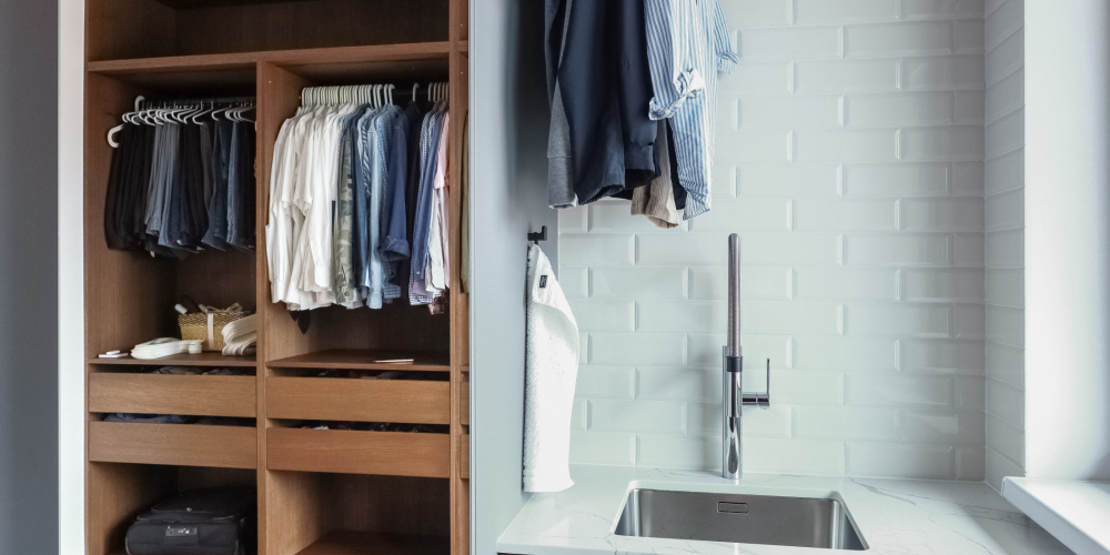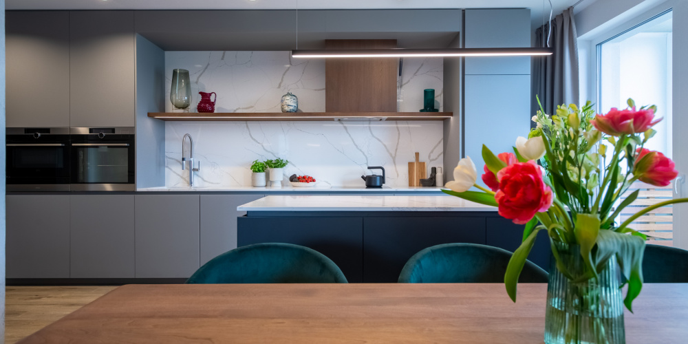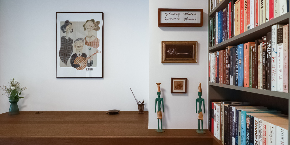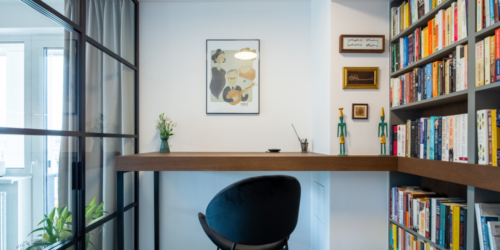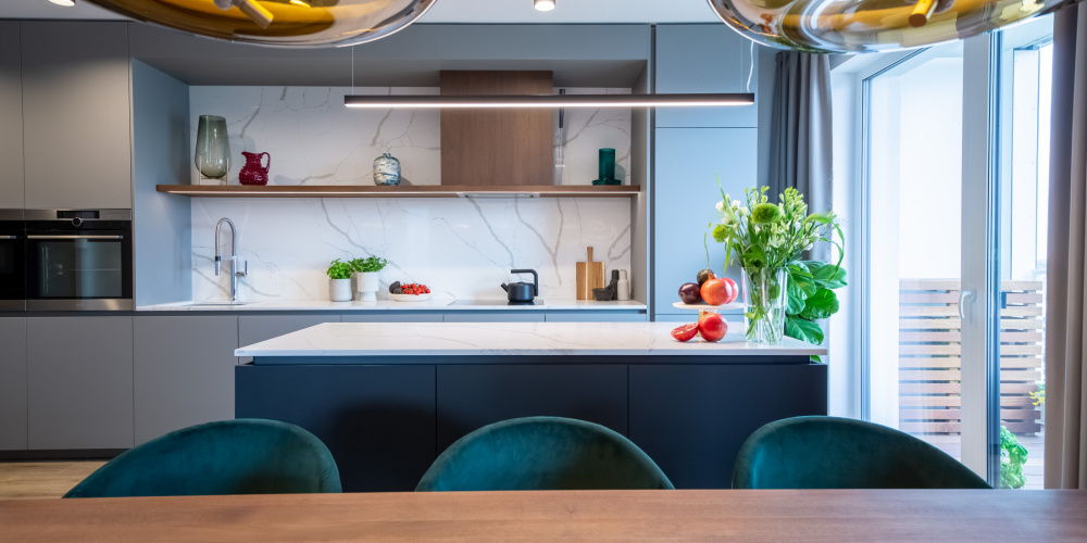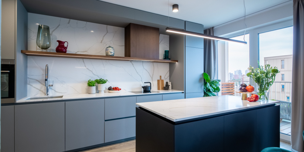 Štedrosť pôdorysu bytu umožnila rozdelenie dennej zóny do dvoch celkov. Prvým je priestranná kuchyňa s kuchynským ostrovčekom. Nočná zóna zahŕňa hlavnú spálňu, hosťovskú spálňu a šatník, na ktorý si klient mohli vyhradiť samostatnú miestnosť vďaka štedrej výmere bytu. AJ preto sme pri návrhu spálni mohli zvoliť minimalistické a vzdušné usporiadanie.
