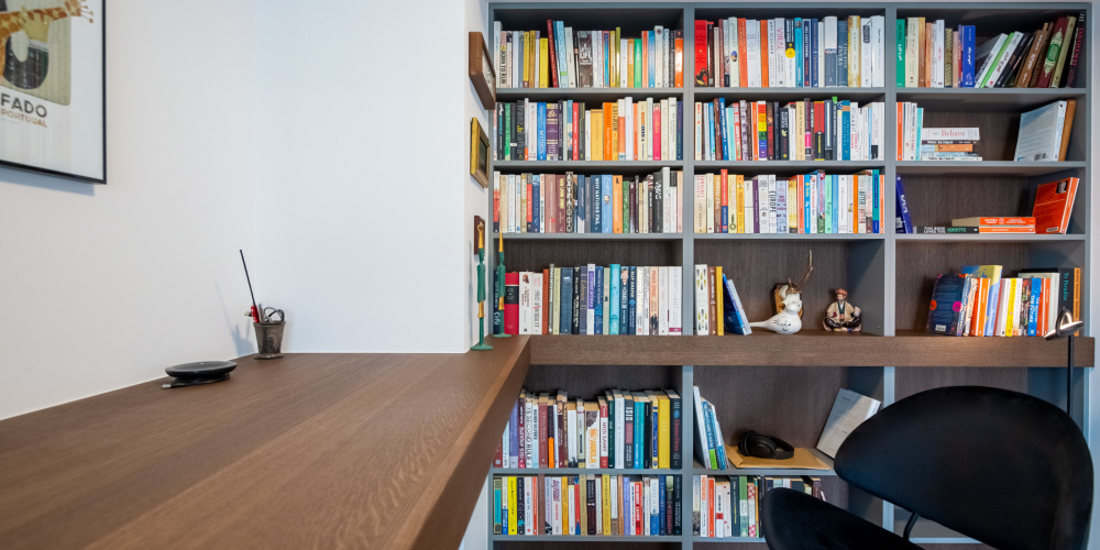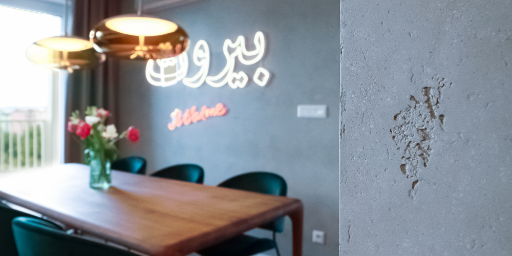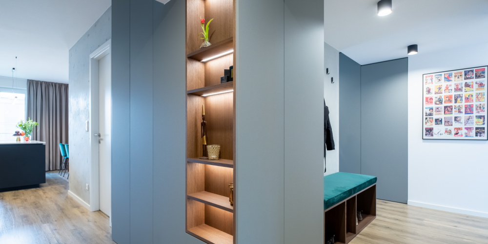 Celý interiér je vizuálne prepojený jednotným farebno-materiálovým riešením. Nábytky na mieru v kombinácii svetlosivého dekoru a tmavej drevenej dyhy, spolu so štruktúrovanými povrchmi betónových stierok, navodzujú tlmený podklad pre vyznenie akcentujúcich prvkov.
